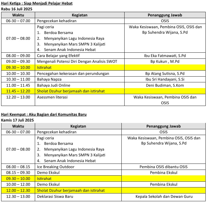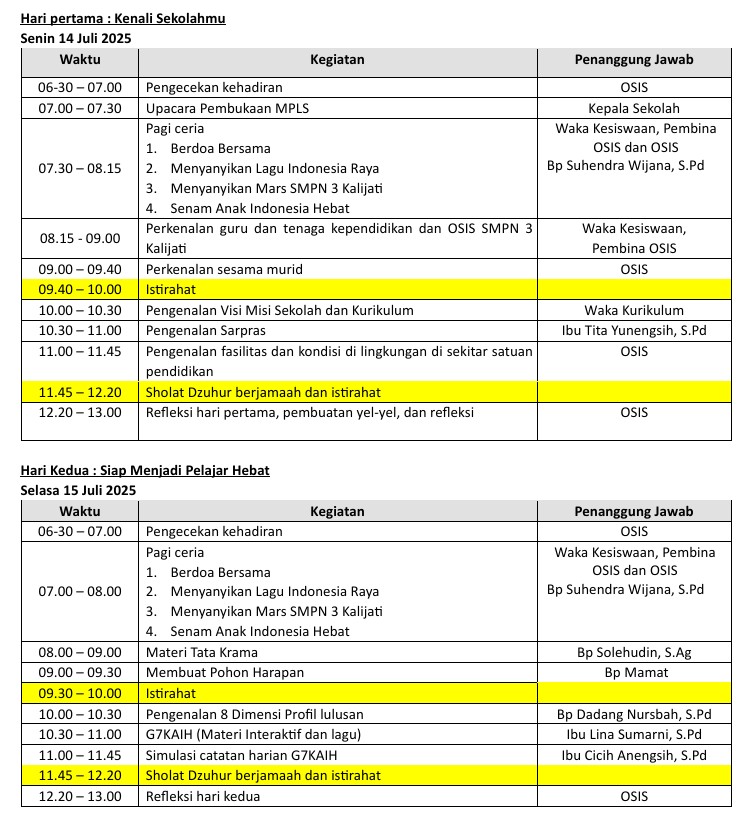 Adapun jadwal dari kegiatan MPLS SMPN 3 Kalijati ini adalah sebagai berikut